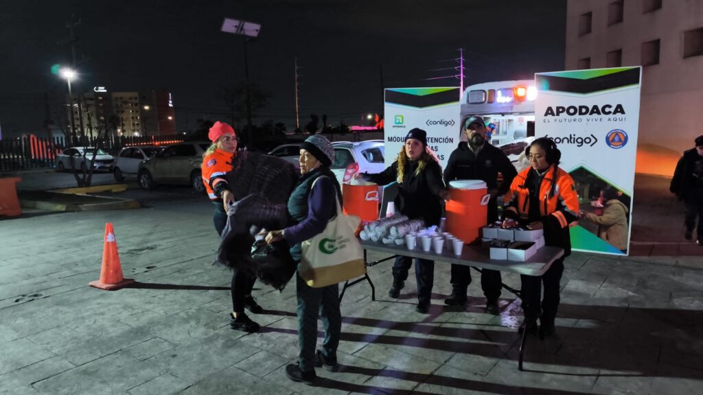 La Dirección de Protección Civil de Apodaca implementó un operativo de apoyo social en puntos estratégicos del municipio, donde distribuyó cobijas y alimentos calientes a personas que permanecen a la intemperie durante las noches, en medio de las bajas temperaturas que se registran en la entidad.