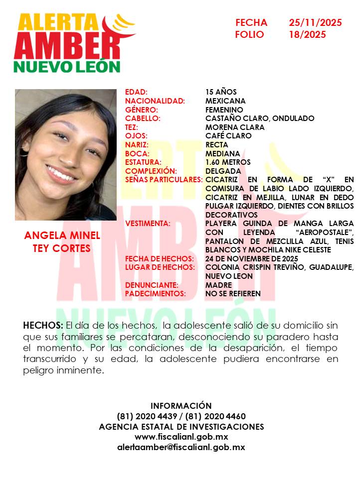Guadalupe, Nuevo León.- Las autoridades de Nuevo León activaron la Alerta Amber para localizar a Angela Minel Tey Cortes, una adolescente de 15 años reportada como desaparecida tras salir de su domicilio sin que su familia se percatara del momento de su partida.