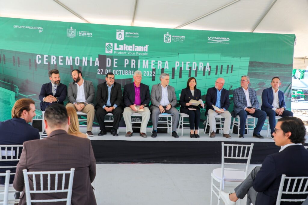 Durante la colocación de la primera piedra de la planta también acudieron: Ivan Rivas, Secretario de Economía del Gobierno del Estado; Federico Rojas, Secretario del Trabajo estatal; Charlie Roberson, CEO de Lakeland; y James P. Aylward, vice presidente de Manufacturing America’s Lakeland Industries.