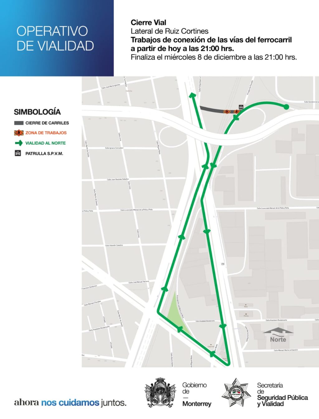 La noche de este martes será cerrada a la circulación de la lateral de la avenida Ruiz Cortines, entre Privada Vía Paredón y calle Felipe Guerra Castro, esto es unos metros antes de su cruce con Bernardo Reyes, por trabajos en la conexión de las vías del ferrocarril, informó la Secretaría de Seguridad Pública y Vialidad de Monterrey.