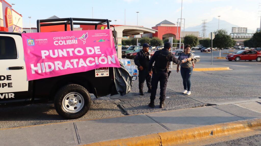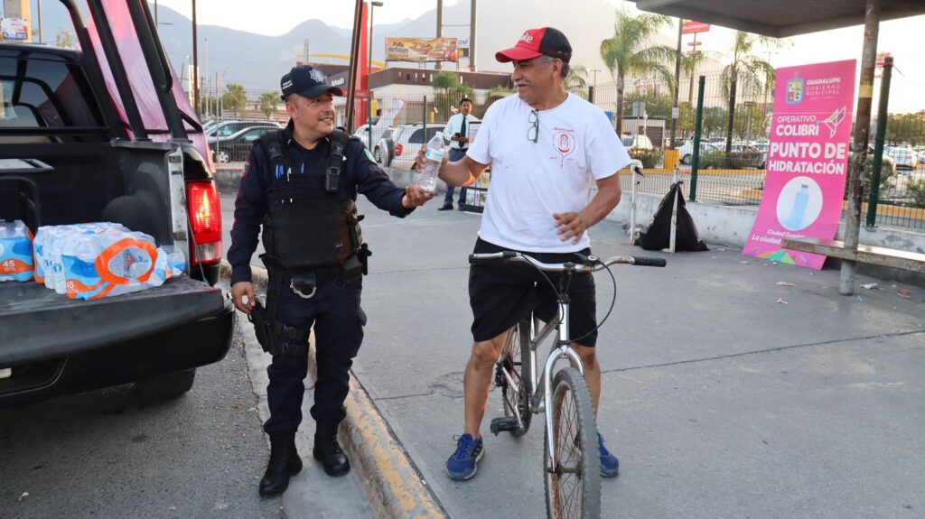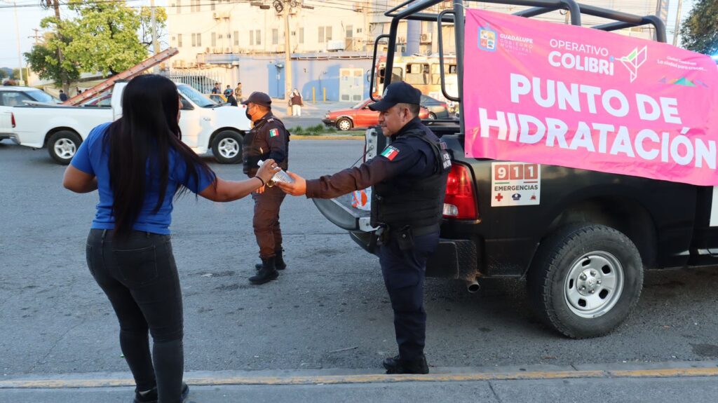 Con la finalidad de prevenir riesgos por golpes de calor, policías de Guadalupe se sumaron al Operativo Colibrí y repartieron este martes agua embotellada a los usuarios de transporte público