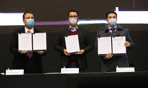 Para formalizar este evento que busca garantizar el derecho primordial a una vivienda digna, se signaron los Convenios de Regularización de Asentamientos Humanos, uno entre el Instituto Nacional del Suelo Sustentable y FOMERREY, así como el de colaboración entre Municipios y este organismo.