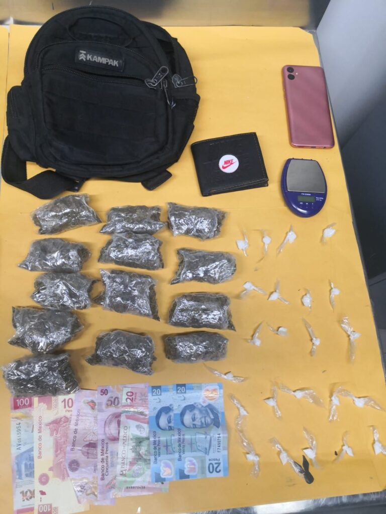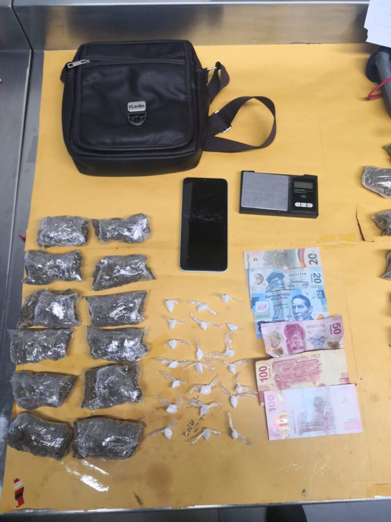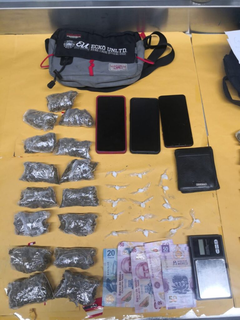 Tras una revisión a sus pertenencias, a los imputados se les aseguró varios paquetes con hierba en su interior, otros más con una sustancia cristalina sólida, teléfonos celulares, dinero en efectivo, carteras, mochilas, y básculas grameras.