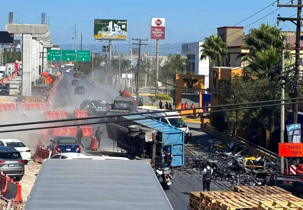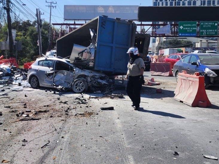 De acuerdo con los primeros reportes de Protección Civil de Nuevo León, un camión de carga habría perdido el sistema de frenos, impactando al menos a cinco vehículos particulares antes de volcarse sobre la carpeta asfáltica.