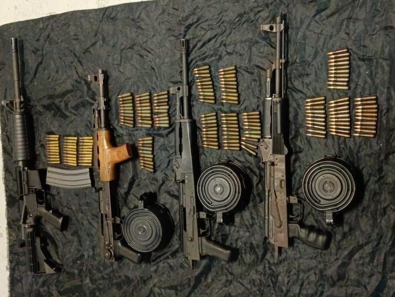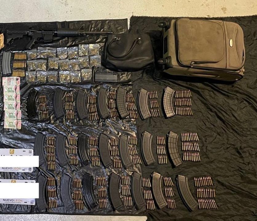 El resultado de la inspección fue el aseguramiento de cinco chalecos, cuatro armas largas abastecidas y municiones, 165 dosis de cristal, 20 bolsas con marihuana, 21 cargadores con balas, dos mil 500 pesos en efectivo, cinco celulares, un bolso, una maleta, cuatro máscaras de látex, nueve gorras y dos placas de circulación del estado de Nuevo León.