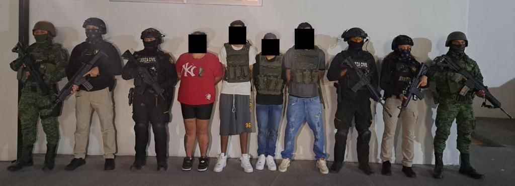 Cuatro hombres, uno de ellos menor de edad, y una mujer fueron capturados en el municipio de Escobedo por elementos de Fuerza Civil, a quienes les confiscaron armas de uso exclusivo del Ejército y más de 200 dosis de droga.