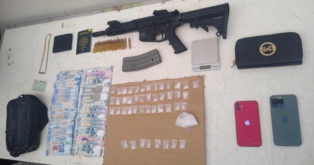 Los oficiales les solicitaron una revisión, en la que aseguraron un arma larga abastecida, una bandolera, 46 dosis de una sustancia similar al cristal, 45 mil pesos en efectivo, una cartera de mano y dos celulares.