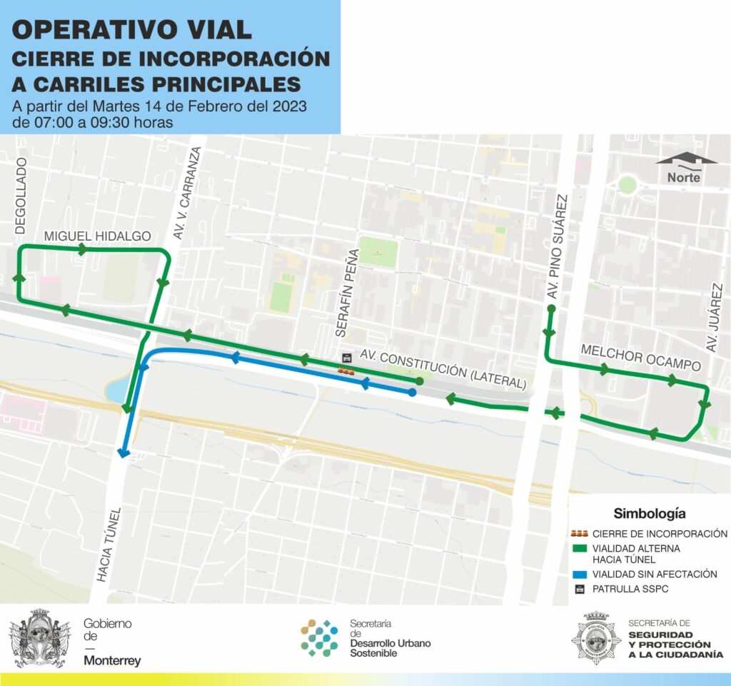Los conductores que circulen por el carril lateral derecho de Constitución y quieran tomar hacia el Túnel de la Loma Larga, deberán continuar hasta la calle Degollado, luego seguir Hidalgo para después tomar Venustiano Carranza al sur.