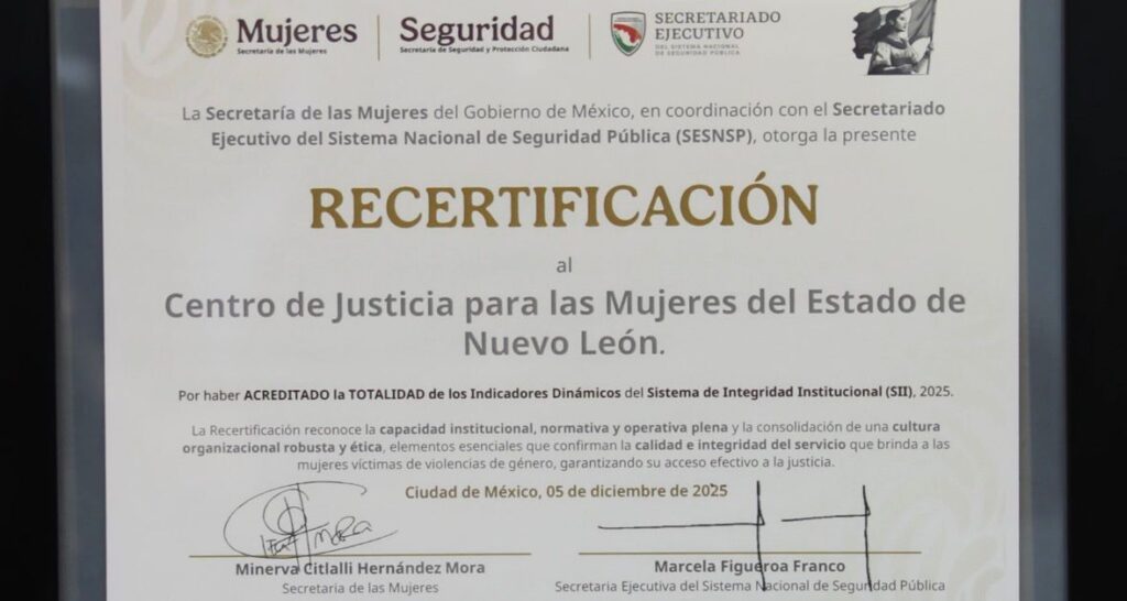 El Centro de Justicia para las Mujeres de Nuevo León (CJM) obtuvo su recertificación federal luego de acreditar el cumplimiento del cien por ciento de los indicadores establecidos en el Sistema de Integridad Institucional, un mecanismo nacional que evalúa la operación, desempeño y ética de los Centros de Justicia para las Mujeres en el país.