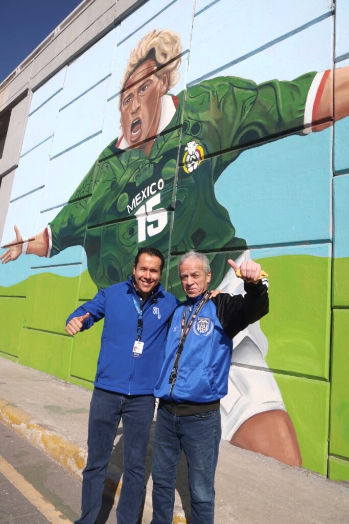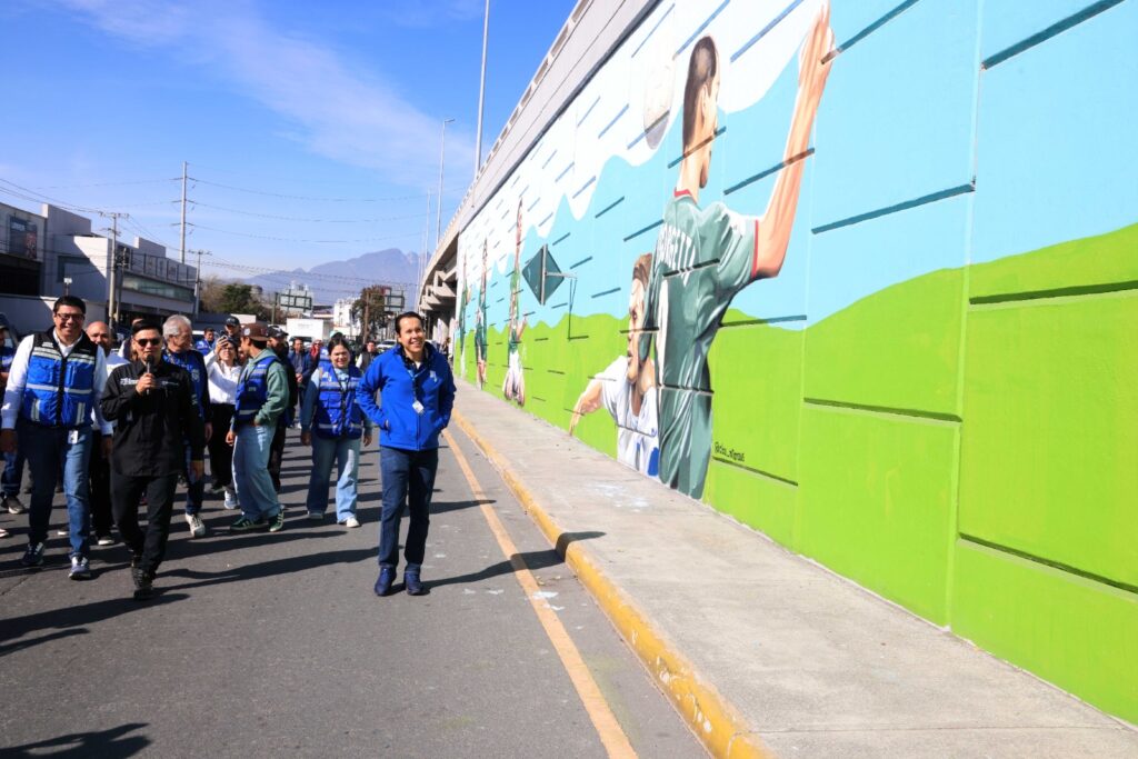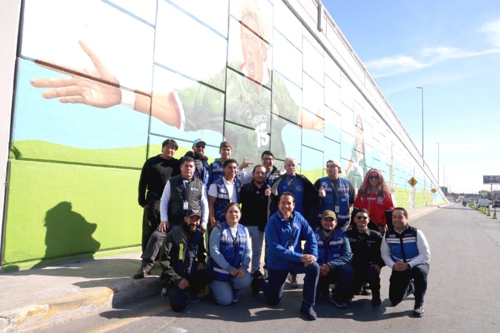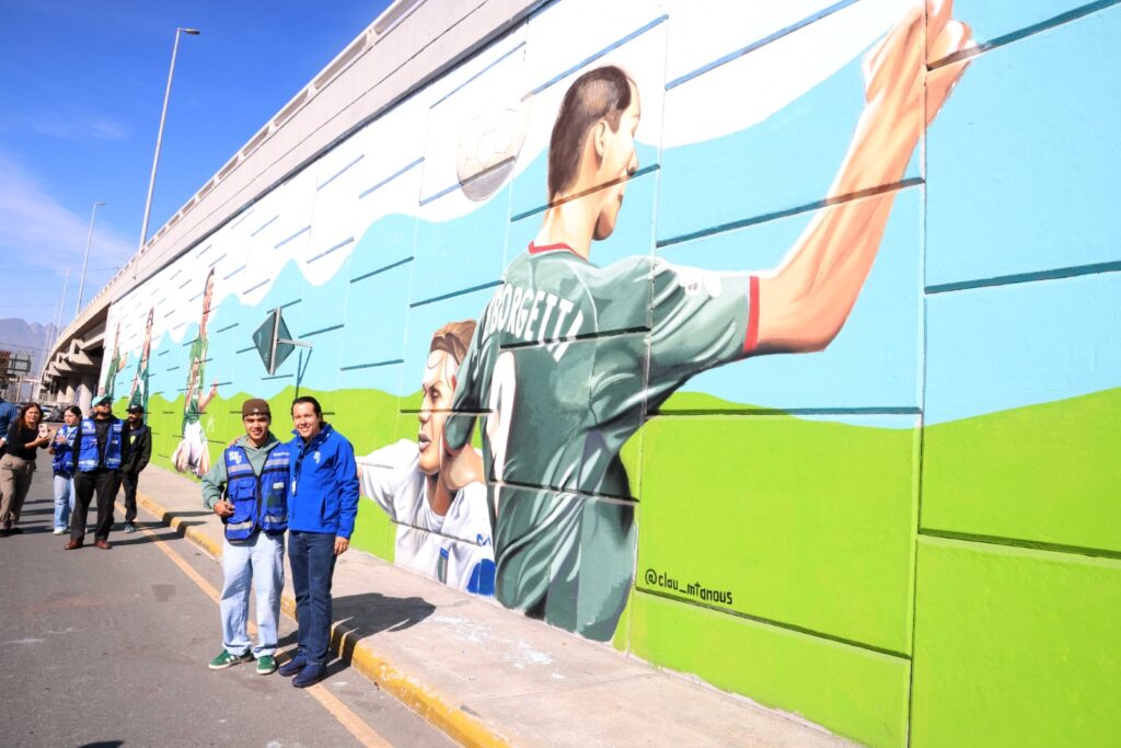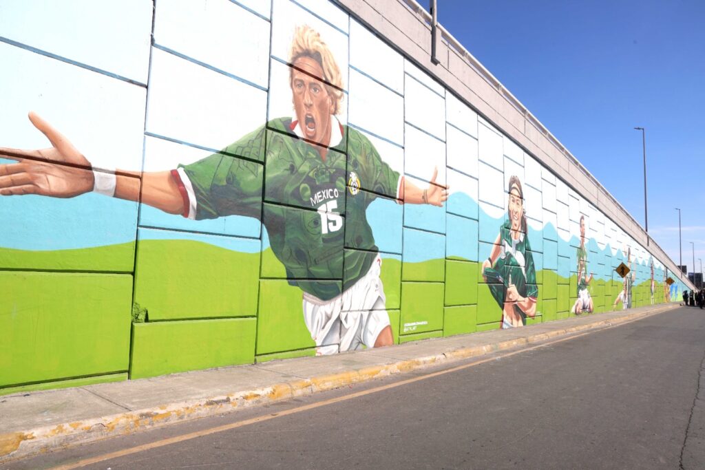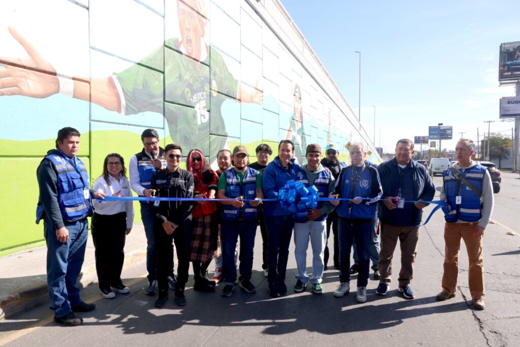 El alcalde Daniel Carrillo Martínez presentó el primer mural, ubicado en el paso a desnivel de las avenidas Nogalar y Los Ángeles. La obra fue realizada por 14 artistas locales y muestra a reconocidos jugadores que han defendido la camiseta de la Selección Mexicana, entre ellos Manuel Negrete, Luis Hernández “El Matador”, Antonio De Nigris, Hirving “Chucky” Lozano, Jared Borgetti, Raúl Jiménez y Jorge Campos.