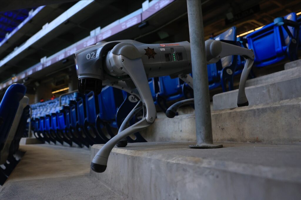Durante el partido de Concachampions disputado en el Estadio BBVA, el Gobierno de Guadalupe desplegó por primera vez sus unidades robóticas K9-X en un evento de gran concentración de personas.