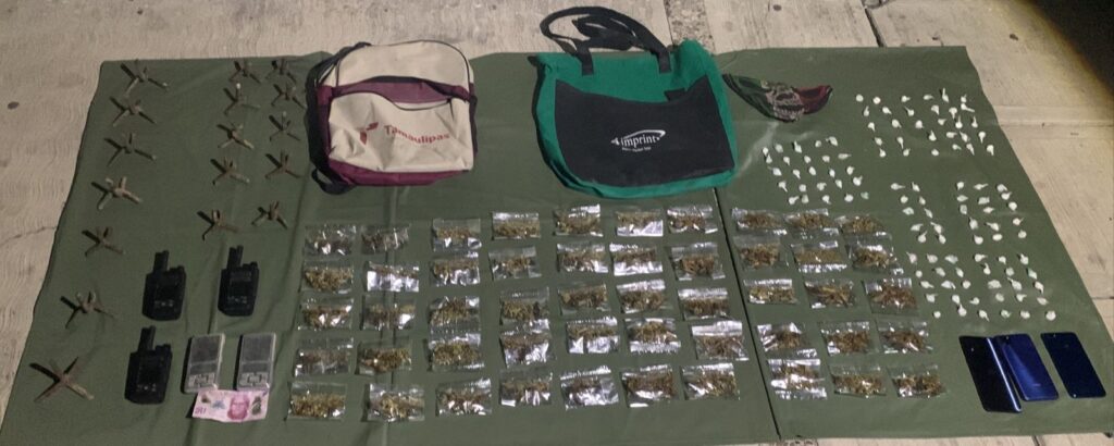 El resultado de la inspección fue el decomiso de 110 envoltorios de cristal; 50 envoltorios con marihuana; tres celulares, dinero en efectivo, 17 poncha llantas, dos mochilas, una bolsa y tres radiofrecuencias.