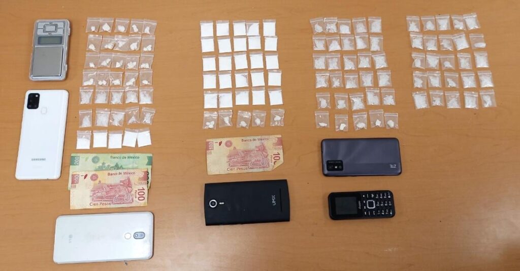 A los ocupantes se les solicitó una revisión precautoria, en la cual se decomisó cinco celulares, 30 envoltorios con un polvo blanco y 30 más en piedra similar a la cocaína, 60 dosis de una sustancia parecida al cristal, una báscula digital y dinero en efectivo.