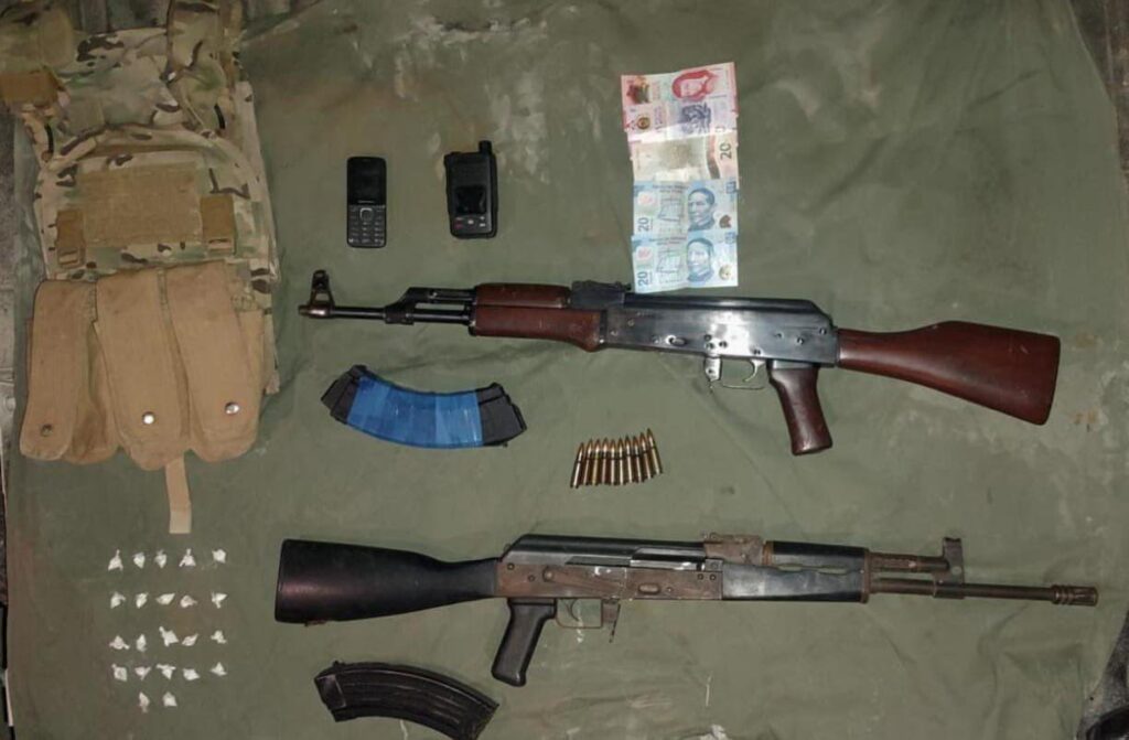 Los sospechosos lograron ser identificados como Oscar “N”, y Brandon “N”, a quienes se les solicitó una revisión y se les decomisó dos armas largas y tres cargadores, envoltorios con cristal, una radiofrecuencia, un chaleco balístico, un teléfono celular y dinero en efectivo.