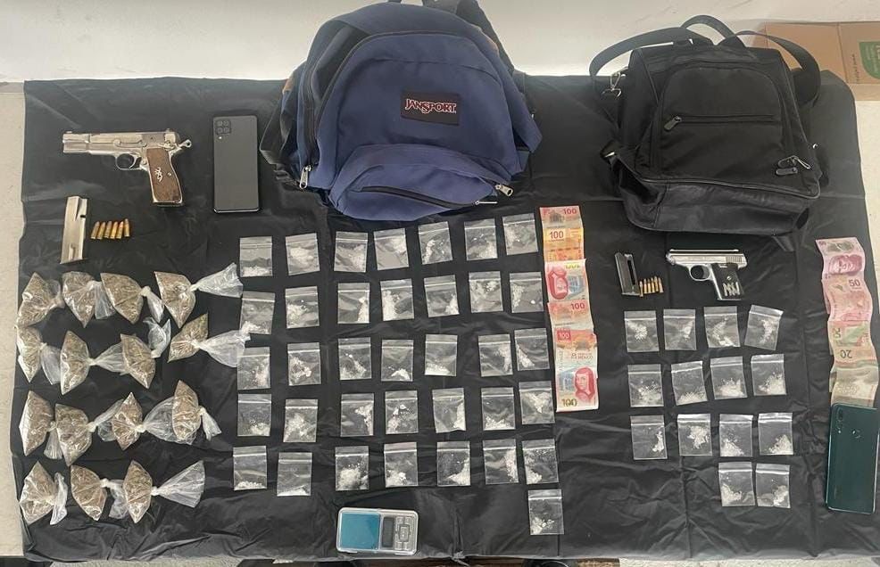 Las personas se identificaron como Gamaliel «N», de 26 años de edad y Paola «N», de 24, a quienes se les incautó, tras una revisión, dos armas de fuego cortas abastecidas, dos mochilas, 50 bolsas de plástico con una sustancia similar al cristal, 15 envoltorios con hierba verde y seca, dos celulares, una báscula digital y dinero en efectivo.