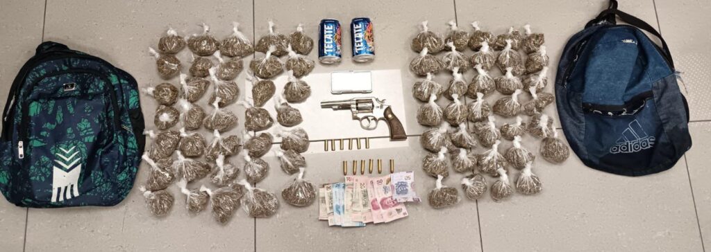 Los oficiales lograron encontrar un arma corta, envoltorios con hierba, una báscula digital, dos mochilas, dos latas de cerveza, dinero en efectivo y seis cartuchos percutidos.