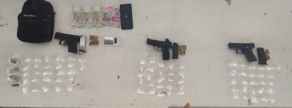 El resultado de la revisión fue el aseguramiento de tres armas cortas abastecidas, envoltorios con una sustancia similar al cristal, tres bolsas con hierba, dinero en efectivo, un cigarrillo artesanal, un celular y una báscula digital.