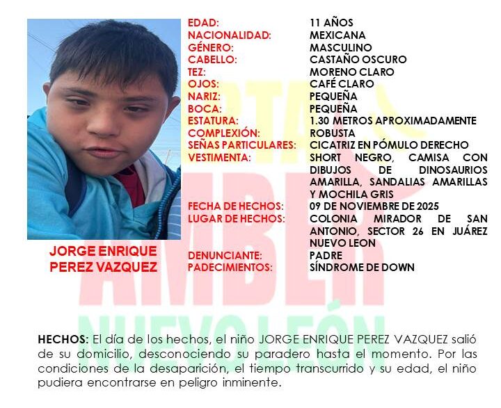 La Fiscalía General de Justicia de Nuevo León activó una Alerta Amber para localizar a Jorge Enrique Pérez Vázquez, un niño de 11 años que fue reportado como desaparecido en el municipio de Juárez.
