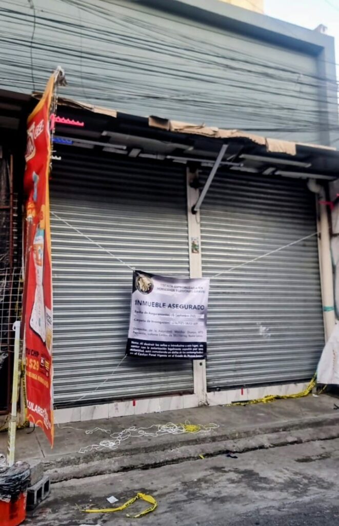 Agentes del Ministerio Público Investigador, junto con detectives de la Agencia Estatal de Investigaciones, personal del Instituto de Ciencias Forenses, la Unidad Canina y elementos de corporaciones coordinadas, realizaron la intervención de dos locales comerciales situados sobre la calle Colegio Civil, entre 5 de mayo y 15 de mayo. La acción contó con la autorización judicial correspondiente.