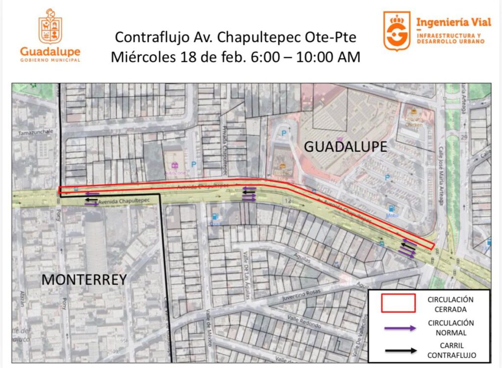 El Municipio de Guadalupe informó el cierre temporal de un carril de la avenida Chapultepec, en dirección oriente–poniente, para realizar trabajos de reparación de una tubería averiada de Agua y Drenaje.