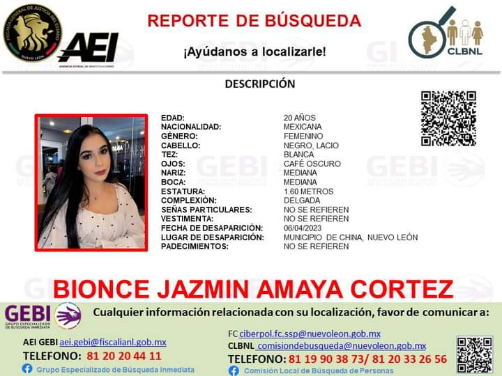 La autoridad inició la búsqueda de la joven Bionce, residente de Texas, luego de perder contacto con ella desde el pasado domingo, ya que sus conocidos mencionaron haberla dejado en China, sin saber paradero hasta el momento.