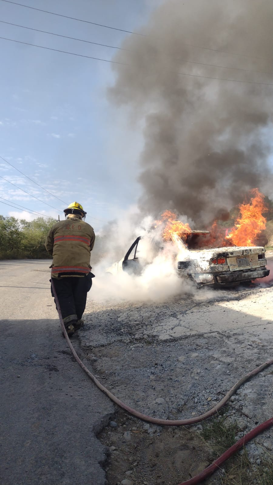 Un vehículo particular fue consumido en su totalidad por el fuego en el municipio de Allende, Nuevo León, luego de registrarse un incendio en la zona del motor mientras se encontraba sobre la carretera al Fraile.