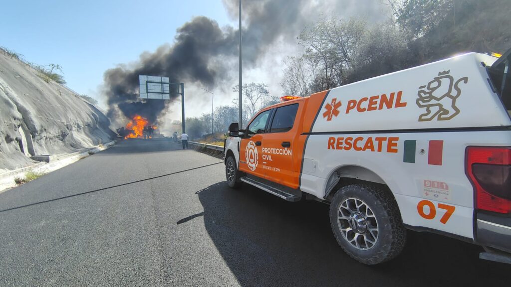 Una pipa se incendió sobre la autopista a Reynosa, cerca de la vía a Tampico, en la colonia Ejido Juárez. El llamado a emergencias se recibió a las 09:55 horas, y de inmediato se movilizó personal de Protección Civil de Nuevo León.