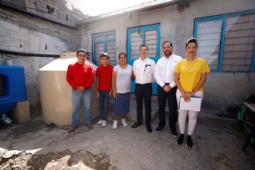 El Presidente Municipal, Luis Donaldo Colosio Riojas, junto con Laura Ballesteros Mancilla, Secretaria de Desarrollo Urbano Sostenible (Seduso), Gabino Hernández de Isla Urbana A.C. y Carlos Garza Galán, Vicepresidente de Asuntos Corporativos de Cemex, empresa que financiará la mitad de la inversión, mostraron el funcionamiento de los Sistemas de Captación de Agua de Lluvia (SCALL).