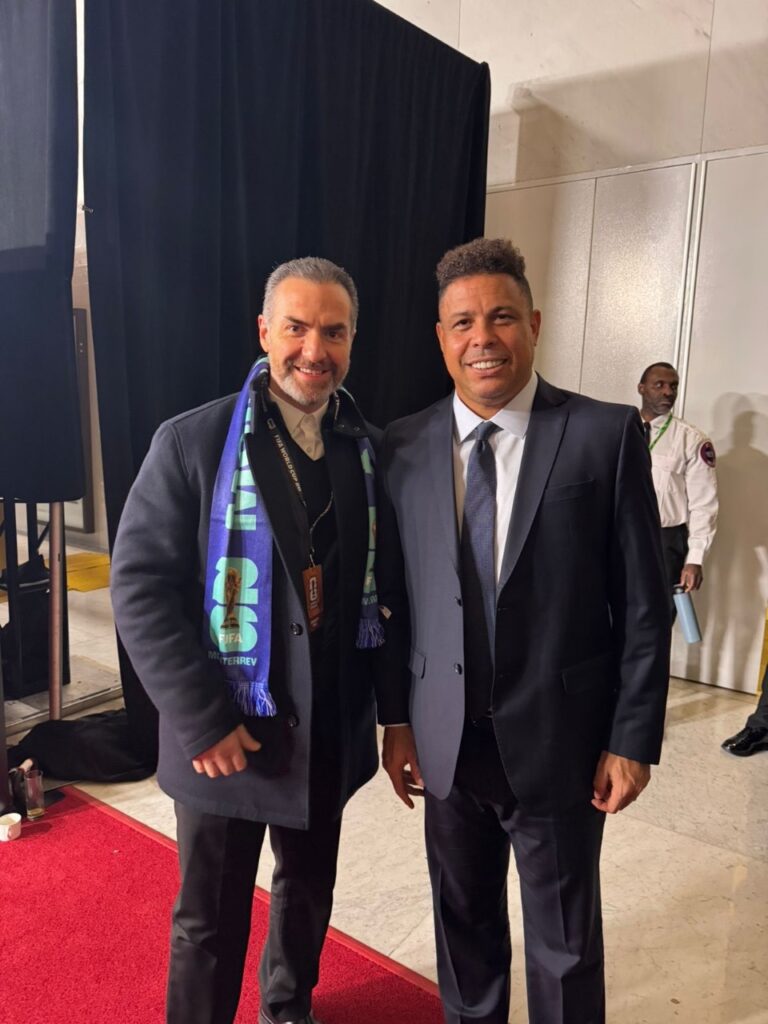 De la Garza, acompañado por su esposa Gaby Oyervides, sostuvo múltiples conversaciones con figuras emblemáticas del futbol mundial durante la ceremonia. Entre ellas destacó un saludo con el ícono mexicano Hugo Sánchez, así como un encuentro con el ex campeón mundial brasileño Ronaldo. El edil también dialogó con el defensor portugués Pepe y con Tony Popovic, director técnico de la selección de Australia.