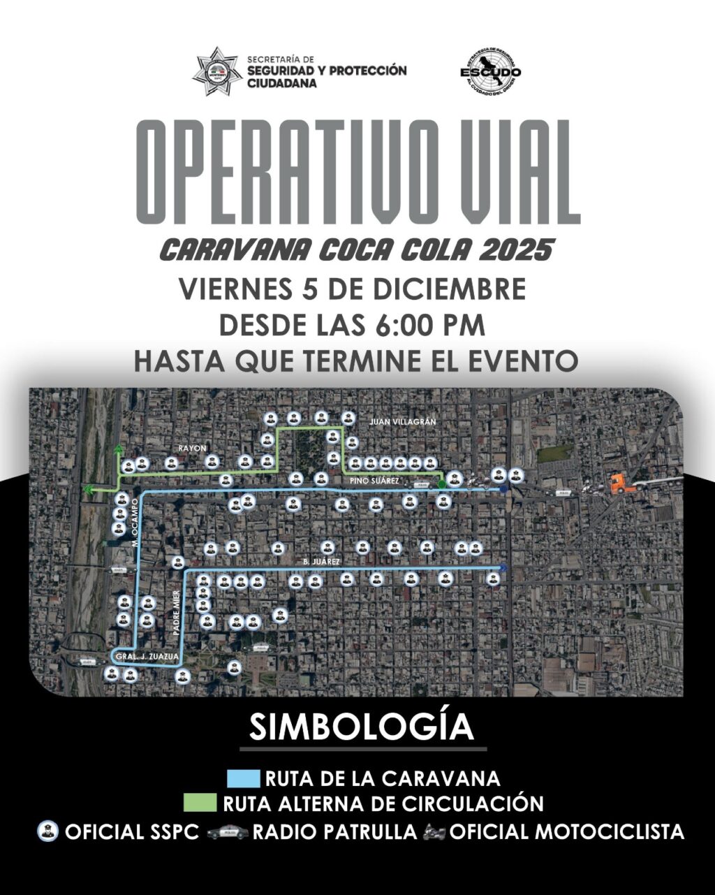 Las autoridades municipales implementarán esta tarde un amplio operativo vial en el primer cuadro de la ciudad con motivo del desfile navideño “Caravana Coca Cola 2025”. El dispositivo comenzará a partir de las 18:00 horas, previo al arranque del contingente en el cruce de Pino Suárez y Colón.