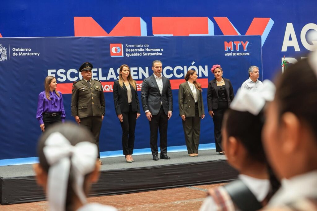 El acto contó con la presencia de Gaby Oyervides, presidenta del DIF Monterrey; Karina Barrón Perales, secretaria de Desarrollo Humano e Igualdad Sustantiva; Ana Villalpando, directora de Educación municipal; Teniente Coronel de Infantería Ubaldo Jiménez, representante de la Séptima Zona Militar, y Juan José Gutiérrez, secretario general de la Sección 50 del SNTE.