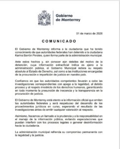 01 de marzo de 2026 El Gobierno de Monterrey informó que tiene conocimiento de la detención de la ciudadana Karina...