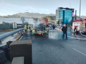 13 de diciembre de 2025 Monterrey, Nuevo León.— La mañana de este sábado, una combi se incendió mientras circulaba sobre...