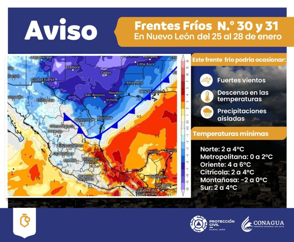 La Comisión Nacional del Agua (CONAGUA), a través del Servicio Meteorológico Nacional (SMN), informó que los frentes fríos número 30 y 31 ingresarán al noreste del país durante el sábado, lo que provocará un marcado descenso de temperatura en el estado de Nuevo León, acompañado de vientos del norte.