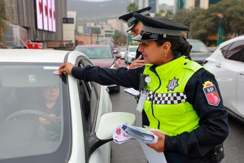 Elementos de la Secretaría de Seguridad Pública de San Pedro Garza García realizaron una jornada de concientización vial en la zona de San Agustín, como parte de las actividades alusivas al Día de San Valentín, con la intención de fomentar una conducción responsable entre la ciudadanía.