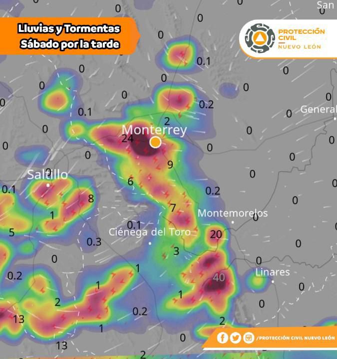 Las precipitaciones estarán acompañadas de tormentas eléctricas, con afectaciones previstas en la zona metropolitana de Monterrey, así como en regiones montañosas, citrícolas, del sur, oriente y norte de la entidad.