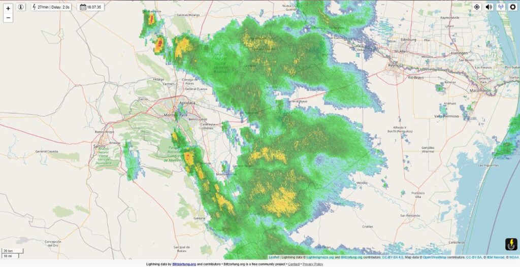 Los radares meteorológicos han detectado lluvias en la zona citrícola, así como en el oriente, sur, norte y parte del área metropolitana de Monterrey.