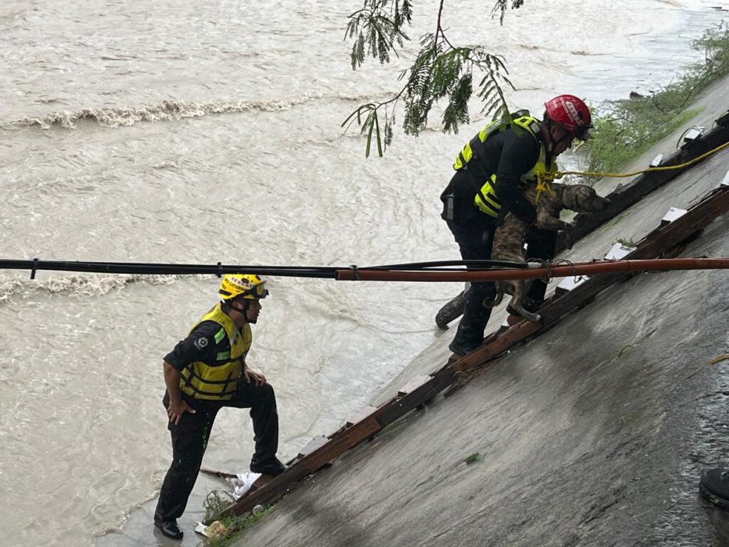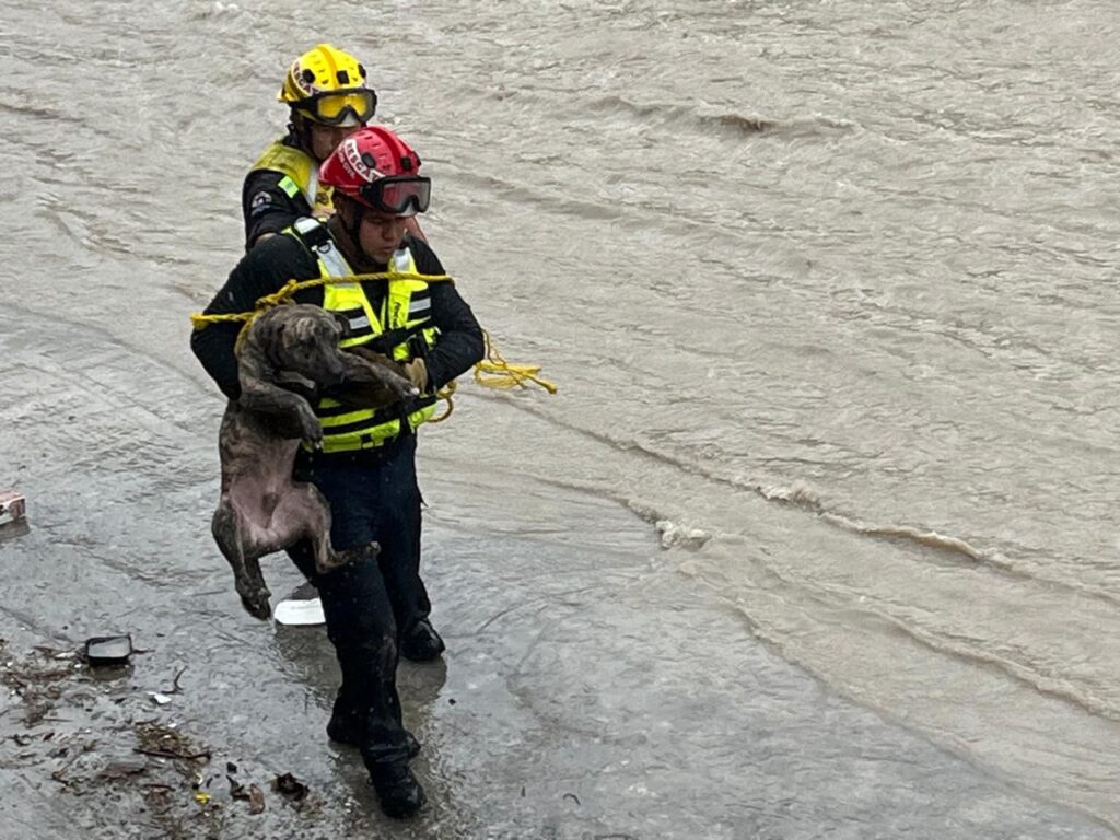 El reporte fue recibido alrededor de las 14:20 horas, por lo que una unidad de auxilio se trasladó de inmediato al lugar. Los rescatistas descendieron hasta el canal, logrando asegurar al canino antes de que la corriente, intensificada por las lluvias recientes, lo arrastrara.