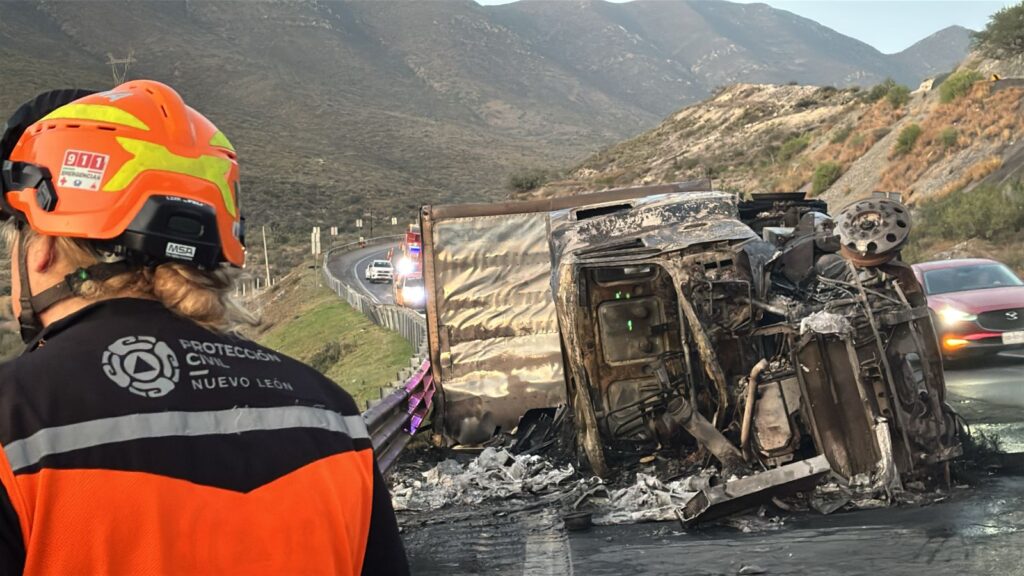El reporte inicial se recibió a las 15:46 horas, y de inmediato personal de Protección Civil de Nuevo León, Protección Civil de García y Bomberos Nuevo León se trasladaron al sitio para controlar la emergencia. Según información de las autoridades, el conductor del vehículo, identificado como Juan Daniel González, de 26 años, informó que el incendio se originó tras la explosión de un neumático, lo que consumió en su totalidad el tractocamión.