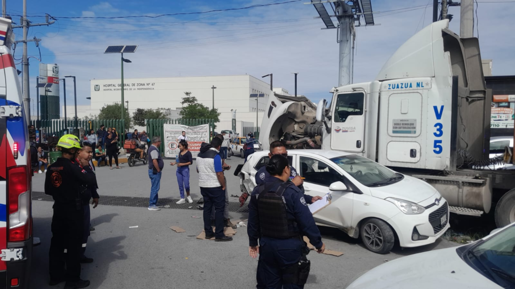 Un tráiler y al menos siete vehículos estuvieron involucrados en un accidente vial la mañana de este lunes frente al Hospital del IMMS número 67 de Apodaca.
