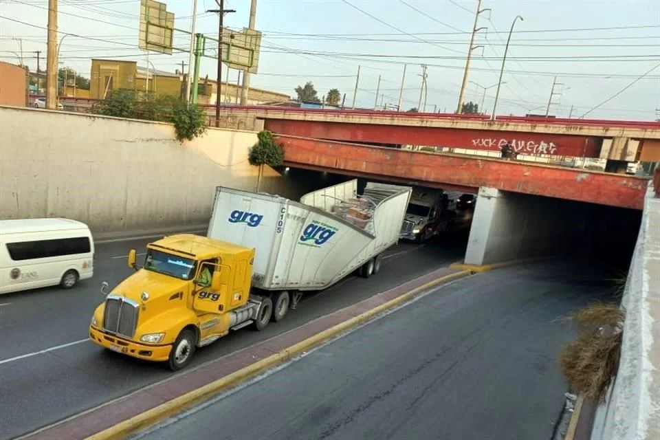 Un tráiler quedó atorado la mañana de este sábado en un paso a desnivel en el municipio de Monterrey.