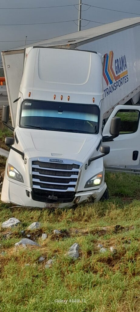 Tráiler se derrapa y queda en camellón en el libramiento de García