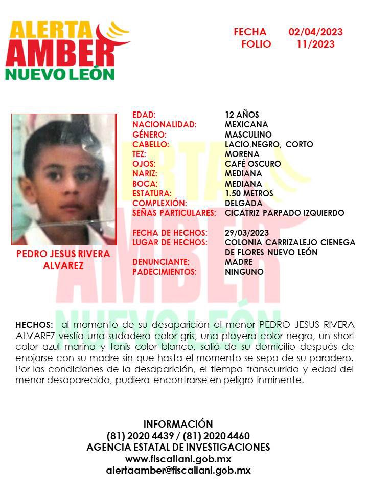 La alerta menciona que el menor, de 12 años de edad, fue visto por última vez el pasado 29 de marzo en la colonia Carrizalejo, en el municipio de Ciénega de Flores.