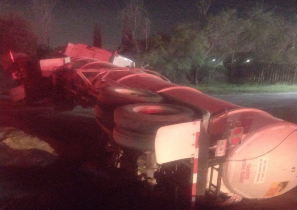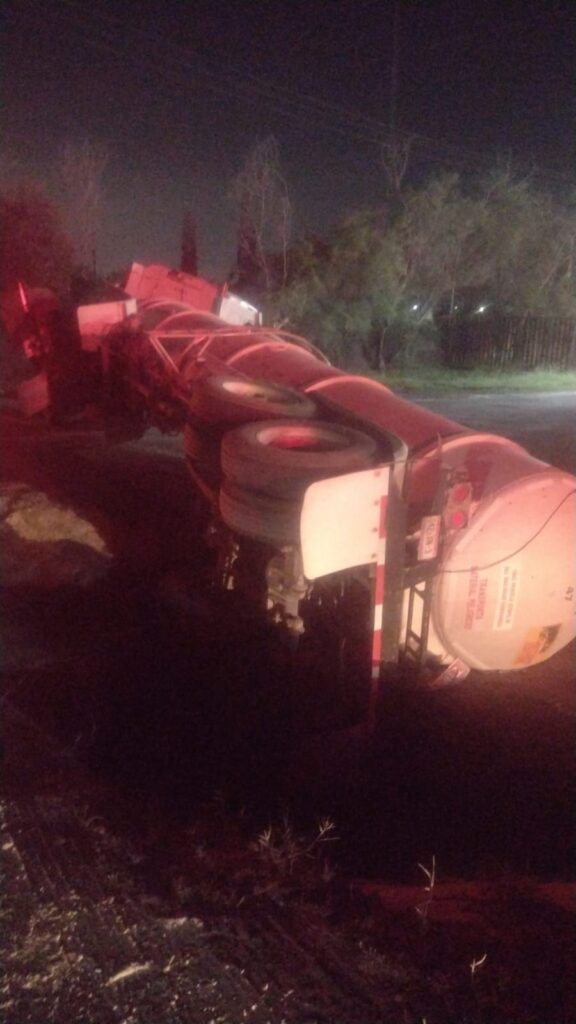Un reporte de un accidente vial fue atendido por Protección Civil Nuevo León, el cual terminó en la volcadura de una pipa transportadora de combustible. El accidente, ocurrido la noche del pasado viernes, se suscitó en la carretera a Laredo, en Apodaca.
