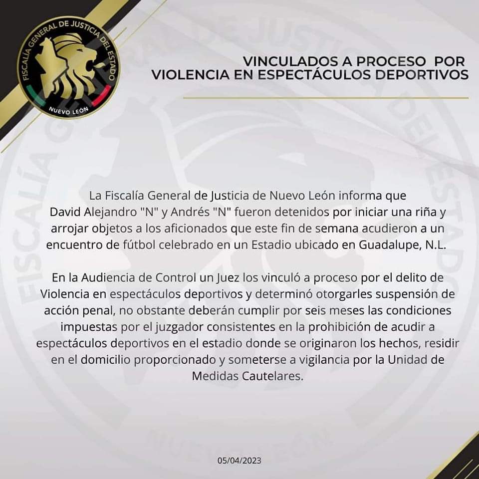 Luego de ser acusados por el delito de violencia en espectáculos deportivos, dos hombres fueron vinculados a proceso. La detención se llevó a cabo el pasado 1 de abril en las inmediaciones del Estadio BBVA, casa del equipo de fútbol Rayados.