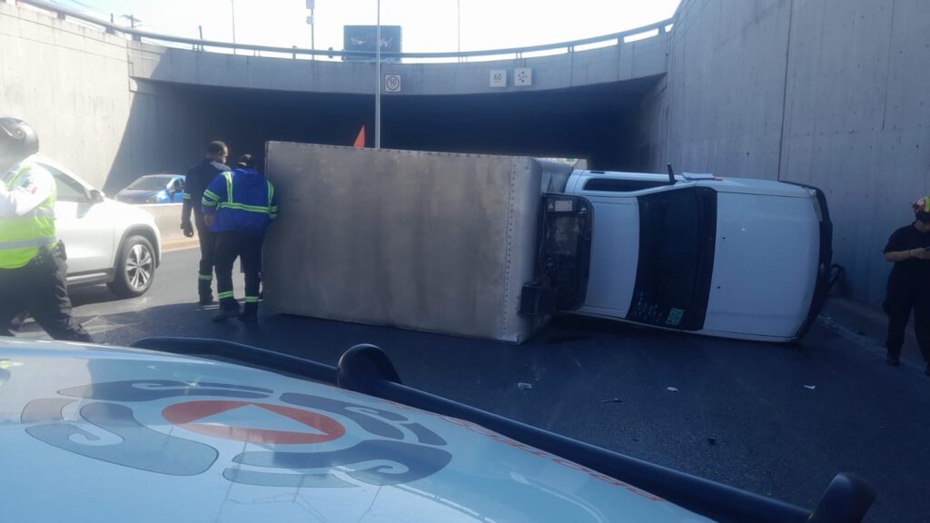 Un accidente vial tipo volcadura se registró este viernes en el cruce de Paseo de los Leones y Paseo de los Insurgentes, en la colonia Cumbres 1, al poniente de Monterrey.